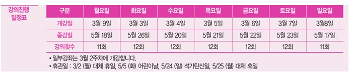 [봄학기 강의진행 일정표 & 센터 휴관일 안내 & 센터 운영시간]
